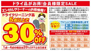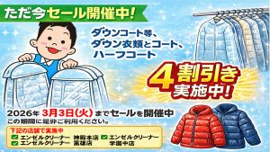 ダウンコート等、ダウン衣類とコート、ハーフコート4割引き実施中 2026年2月16日 最終更新日時 : 2026年2月27日 WP_101@Angl-Tanig2024 2026年3月3日(火)までセールを開催中、この期間に是非ご利用ください。 下記店舗で実施中 エンゼルクリーナー 神殿本店 エンゼルクリーナー 富雄店 エンゼルクリーナー 学園中店 期間:2026年3月3日(火)まで